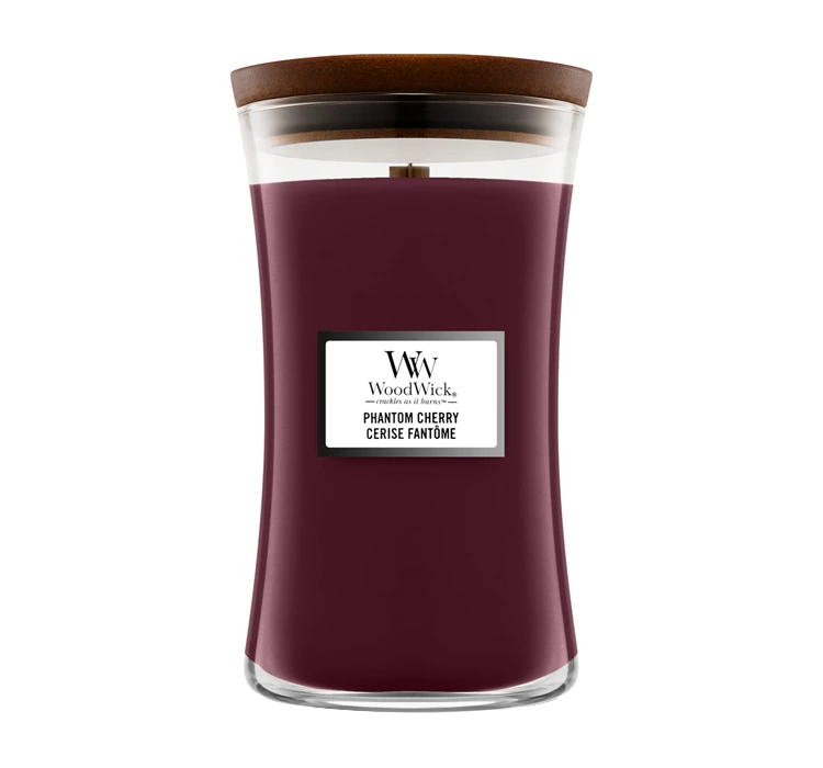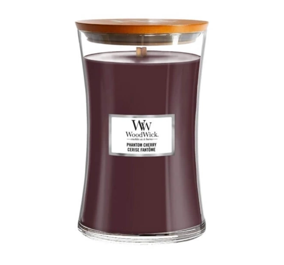 Woodwick Phantom Cherry scented candle is the scent of a dark forest that envelops the senses like fog shrouding a mysterious path in the heart of the night.