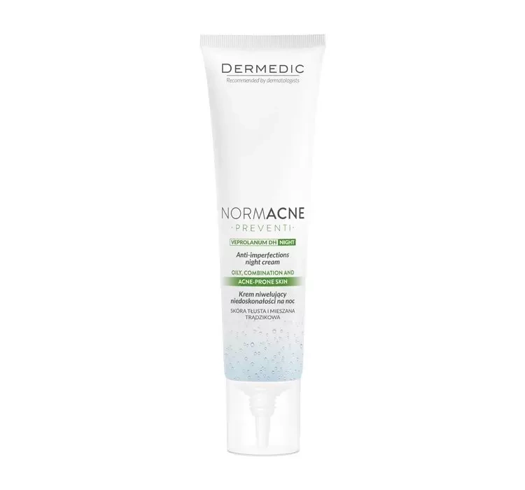 Dermedic Normacne Preventi anti-imperfections night cream is designed for combination and oily skin prone to acne. The cream moisturizes, calms skin inflammations, exfoliates dead epidermis cells, stimulates the epidermis to regenerate and effectively fights acne while preventing it from reappearing.