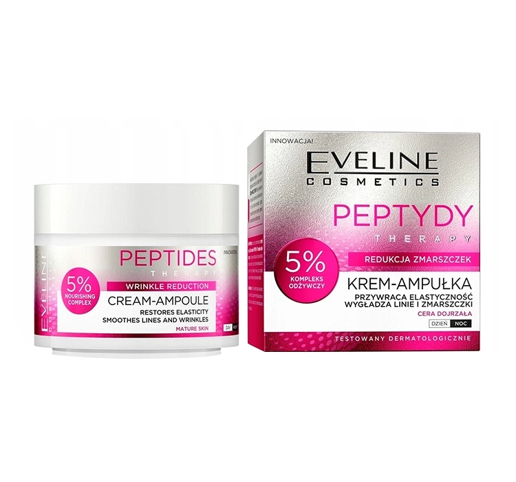 Eveline Cream-Ampoule Therapy with Peptides is recommended for all skin types, especially mature skin. Its innovative formula with precious 5% nutritional complex and peptides has a positive effect on the appearance and condition of the skin.