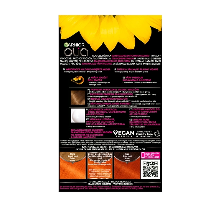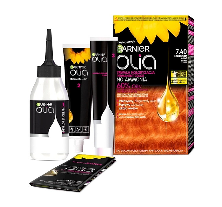 Garnier Olia is a complete palette of permanent hair dyes, containing as much as 60% of natural flower oils for a deep and ultra-shiny color.