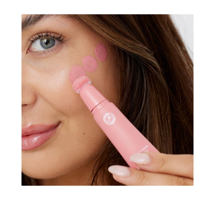 Step 2. Lightly press the tube until a small amount of product comes out of the sponge. Apply small dots of cream blush to the cheekbones using the applicator, then blend using a sponge, brush or fingertips.