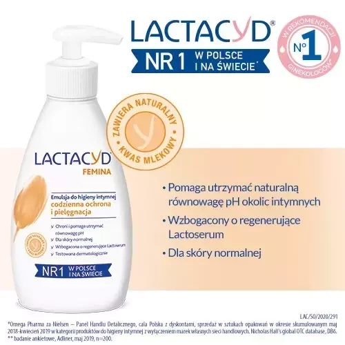 Lactacyd Femina is a mild emulsion for intimate hygiene with lactic acid.