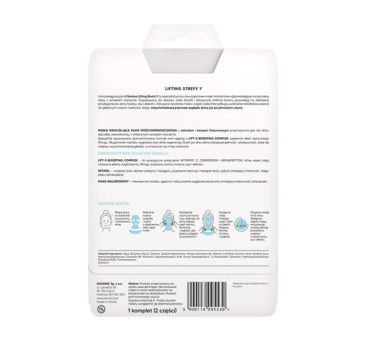 L'biotica Lifting Zone Y Moisturizing face mask is based on a combination of Lift-3-Boosting Complex, vitamin C, ceramides, hexapeptide, retinol and hyualuronic acid.