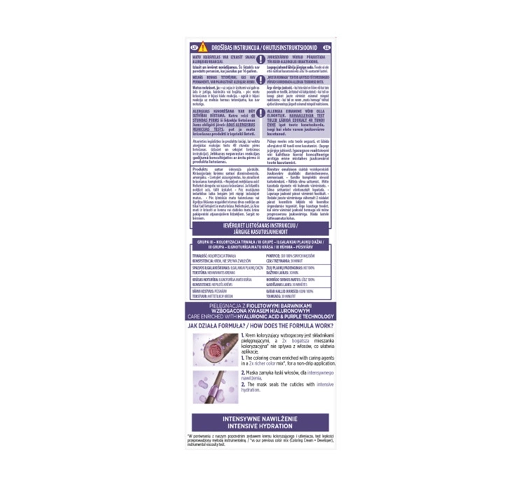 The package contains: hair dye, 48 ml oxidizing milk, 72 ml post-colour shampoo, 12 ml hair mask, 60 ml applicator gloves instruction