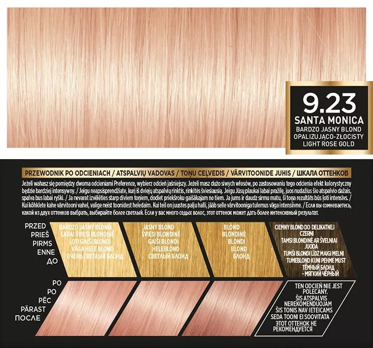 The package of L’Oréal Paris Préférence contains::1 colourant gel, 60 ml 1 developer cream, 60 ml 1 conditioning balm, 54 ml 1 instruction for use 1 pair of high-quality gloves