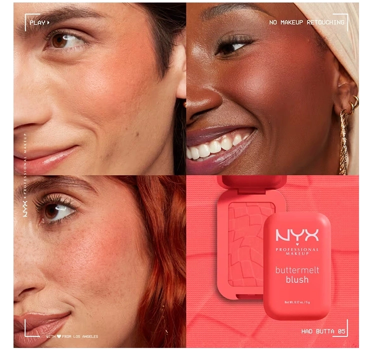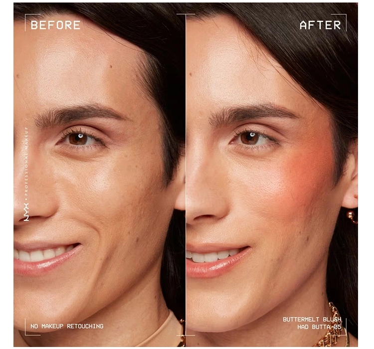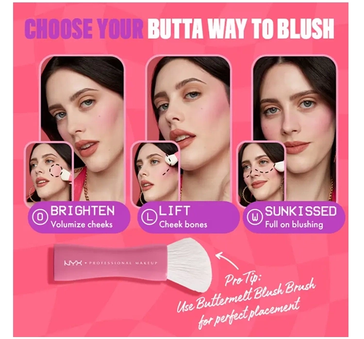 NYX Professional Makeup Buttermelt Blush is a pressed cosmetic that blends like powder and glides on smoothly like butter, leaving a soft cloud of color and a natural-looking blush. Play with makeup, depending on the shape of your face. Apply the blush in an L (Lift) motion, O (Brighten) for a youthful and fresh look, as well as for a fashionable sunkissed look - by applying blush to the tops of the cheeks and the bridge of the nose. Try these tips!