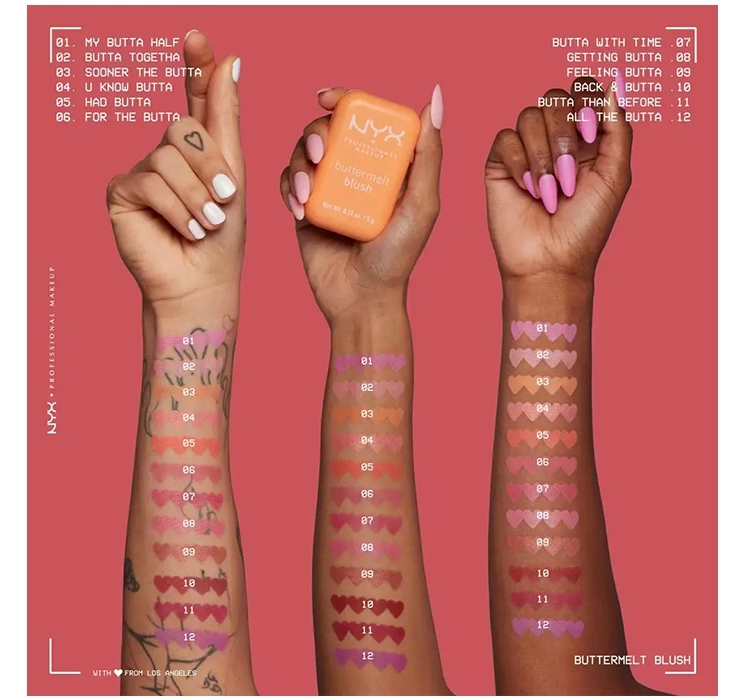 NYX Professional Makeup Buttermelt Blush is a pressed cosmetic that blends like powder and glides on smoothly like butter, leaving a soft cloud of color and a natural-looking blush. Play with makeup, depending on the shape of your face. Apply the blush in an L (Lift) motion, O (Brighten) for a youthful and fresh look, as well as for a fashionable sunkissed look - by applying blush to the tops of the cheeks and the bridge of the nose. Try these tips!