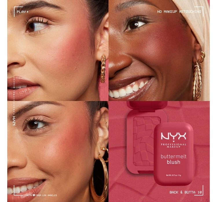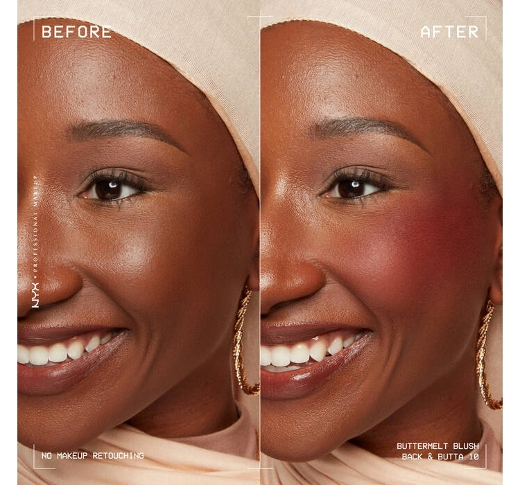 colour: 10 Back and Butta - Deep RosewoodNYX Professional Makeup Buttermelt Blush combines a velvety soft texture and visible pigment. Available in several shades - from matte to shimmering. The blush offers up to 12 hours of wear without fading or smudging. Enriched with mango butter, almond butter and shea butter, it nourishes and smoothes the skin.
