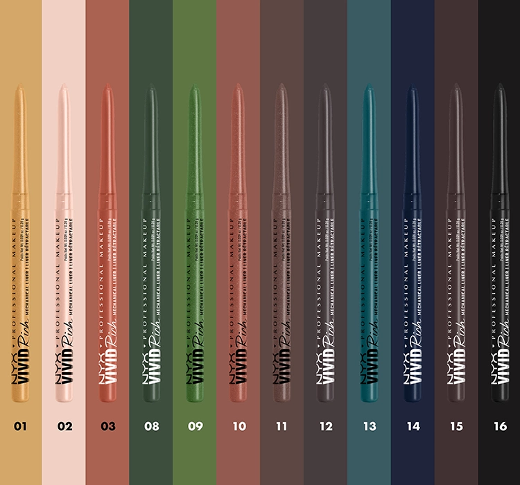 NYX Professional Makeup Vivid Rich Mechanical Pencil is a series of automatic eye pencils in 12 colors inspired by gems - from gold, through pearl, to expressive emerald or deep aquamarine.