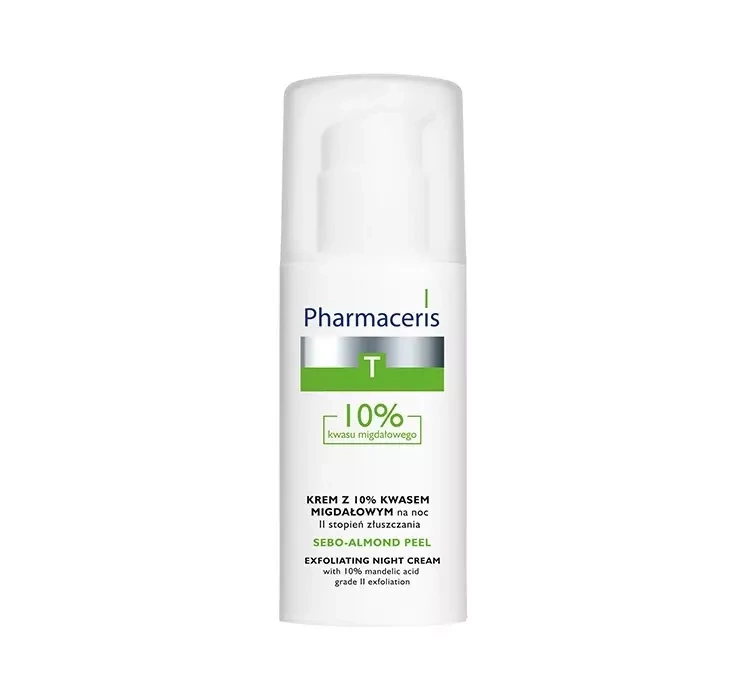 Pharmaceris T is a range of dermocosmetics for acne-prone skin. It includes cleansing, soothing and care cosmetics. Acne lesions, which are particularly characteristic of young skin, are not necessarily age-related. Regardless of age, acne skin care is based on the same principles: sun protection, regular cleansing and moisturising.The Pharmaceris T line includes cosmetics to help with each of these steps. Pharmaceris T Sebo-Almond Peel Night Cream with 10% mandelic acid is intended for the daily care of acne-prone, sensitive, oily and uneven-toned skin. It can be safely used all year round. In summer, however, a cream with SPF 20 is recommended. T Sebo-Almond Peel night cream regulates sebum secretion, reduces acne lesions and prevents the formation of new ones. Mandelic acid and sweet almond protein smooth the skin texture, exfoliate dead skin, reduce the risk of post-acne scars, and discolouration.