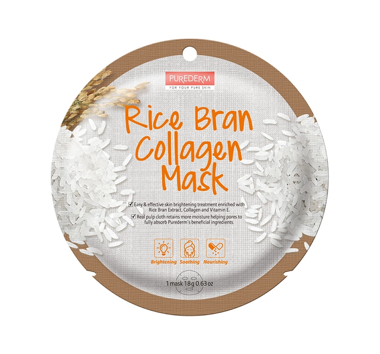 Korea Purederm Rice Bran Collagen Mask has been enriched with rice bran oil, which is known for its nourishing and smoothing properties. Additionally, rice bran contains antioxidants and minerals that support skin regeneration and help fight free radicals.
