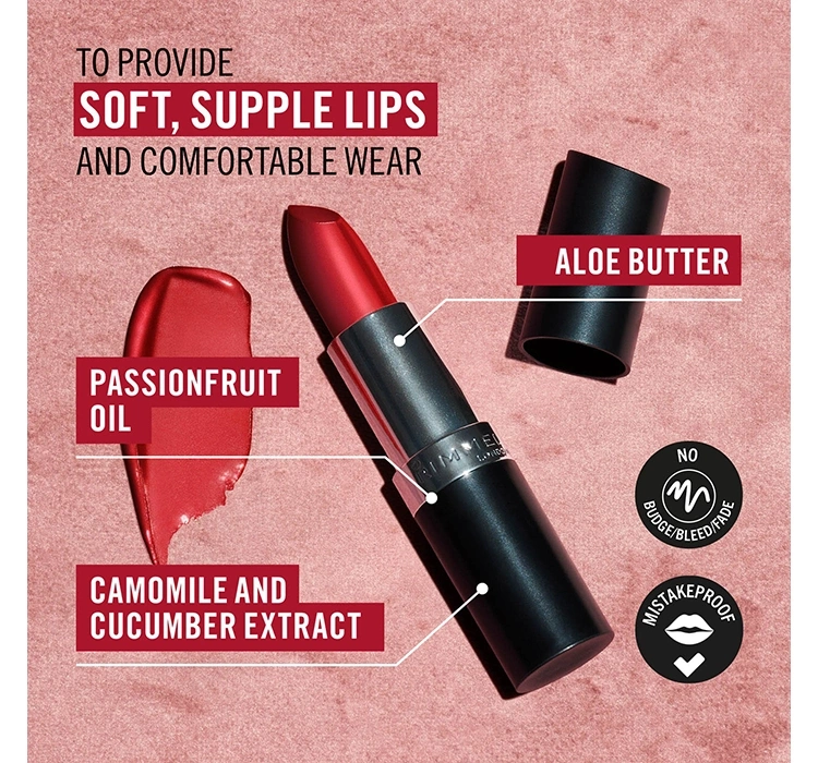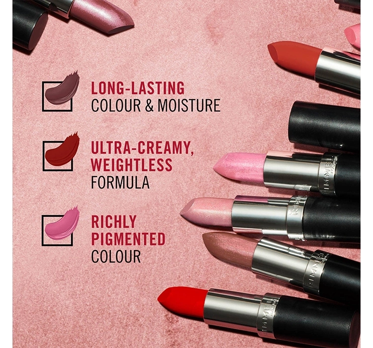 Rimmel Lasting Finish Satin Lipstick has a vegan formula with aloe butter, passion fruit oil, chamomile and cucumber extract to make your lips soft, supple and comfortably moisturized. Its incredibly creamy, lightweight texture is easy to apply and melts onto the lips, coating them with noticeable color.