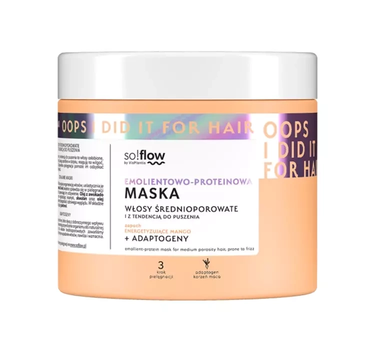 So!flow Emollient-Protein mask for medium porosity hair perfectly moisturizes, strengthens and regenerates the hair, making it more boncy. It leaves the strands soft and shiny.