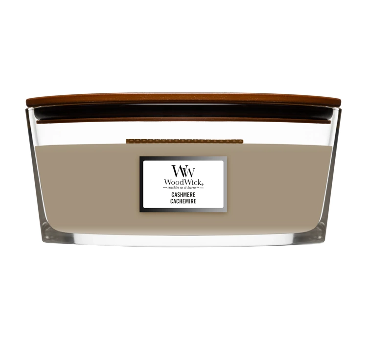 WoodWick Ellipse Candle Cashmere is a cozy fragrance filled with the aroma of sandalwood, tonka bean and quince.