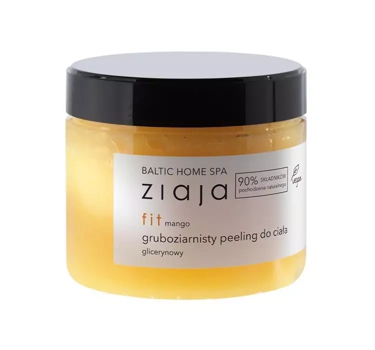 Baltic Home Spa Fit Coarse-Grained Body Scrub by Ziaja exfoliates dead skin cells, softens and tones the skin. The product has the scent of juicy mango. Its composition includes as much as 90% of ingredients of natural origin, including caffeine, fig extract, illipe butter, silicon, glycosaminoglycans and alginic acid. These ingredients moisturize, oil, increase skin tension and have an anti-cellulite effect. The coarse-grained scrub will leave the skin soft, smooth and healthy-looking. Vegan product.